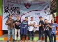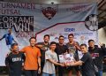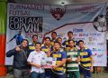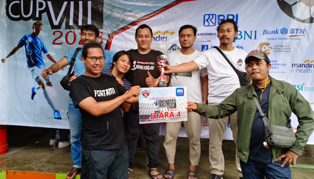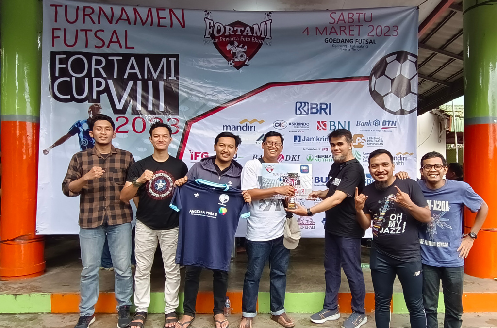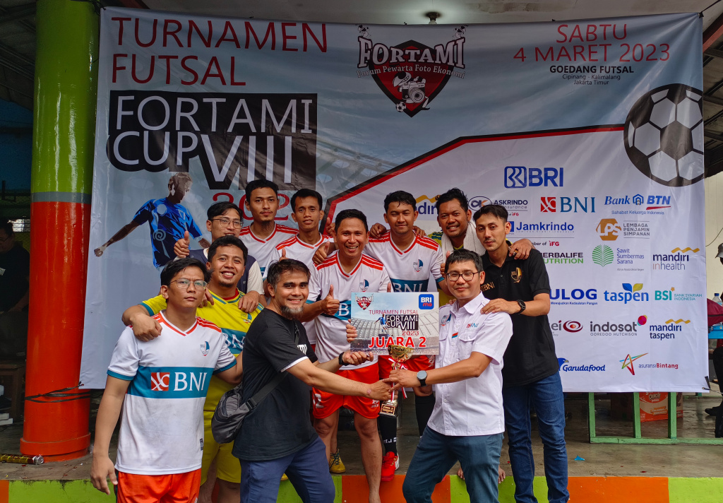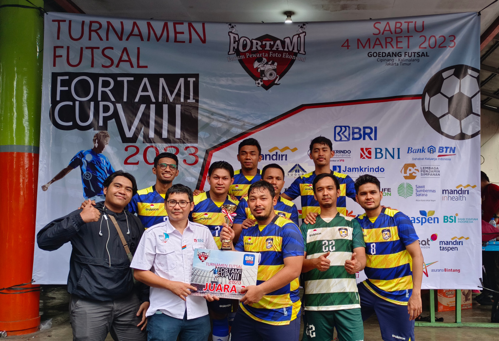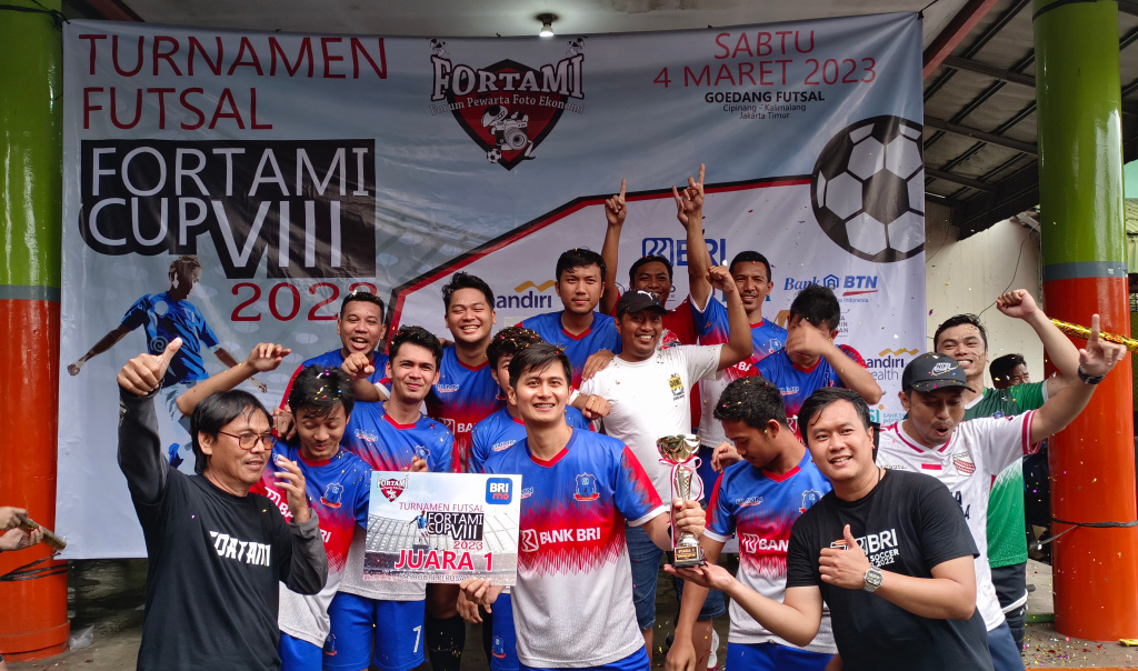 Pembina Fortami (Pewarta Foto Ekonomi) Endang Marabonta menyerahkan piala dan hadiah uang tunai kepada team futsal Bank BRI yang tampil sebagai juara pertama turnamen futsal Fortami Cup VIII 2023 di Jakarta, Sabtu (4/3). Forum Pewarta Foto Ekonomi (Fortami) kembali menggelar turnamen pertandingan tahunan futsal yang kedelapan kalinya untuk kalangan wartawan ekonomi dan antar korporat. Tampil sebagai juara untuk kelompok korporat pada turnamen ini adalah Bank BRI, juara kedua Bank BNI, juara ketiga Mandiri Inhealth , dan keempat adalah Pertamina Lubricants . Untuk kelompok forum wartawan juara pertama adalah Fortami, juara kedua adalah Forum BUMN, ketiga adalah Forwahub dan Juara keempat Camaro Sementara Top Score diraih oleh BNI dan Fortami.