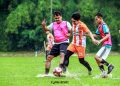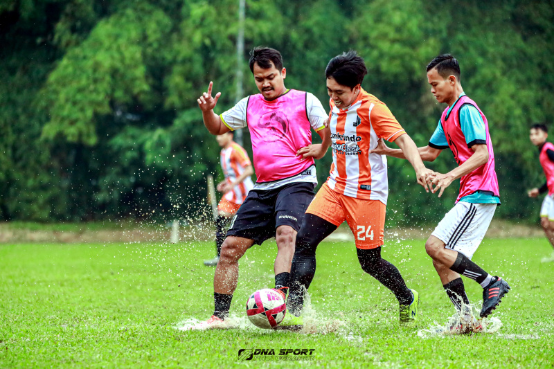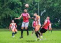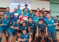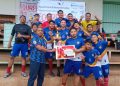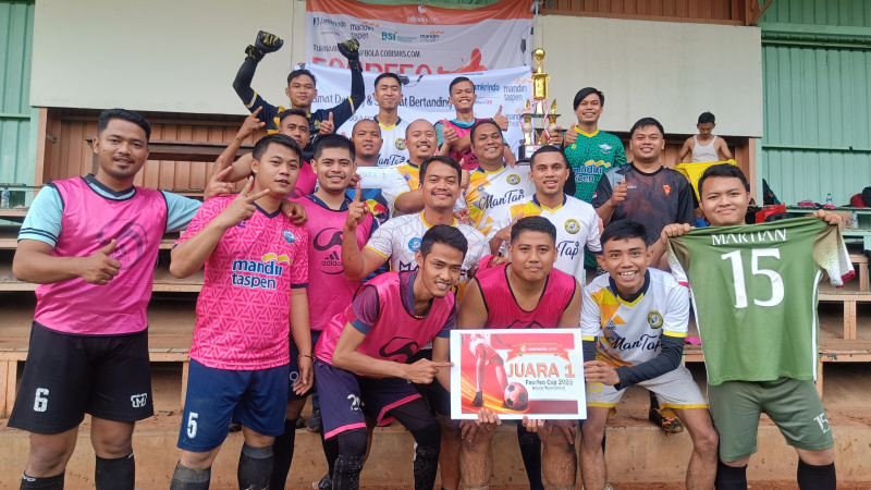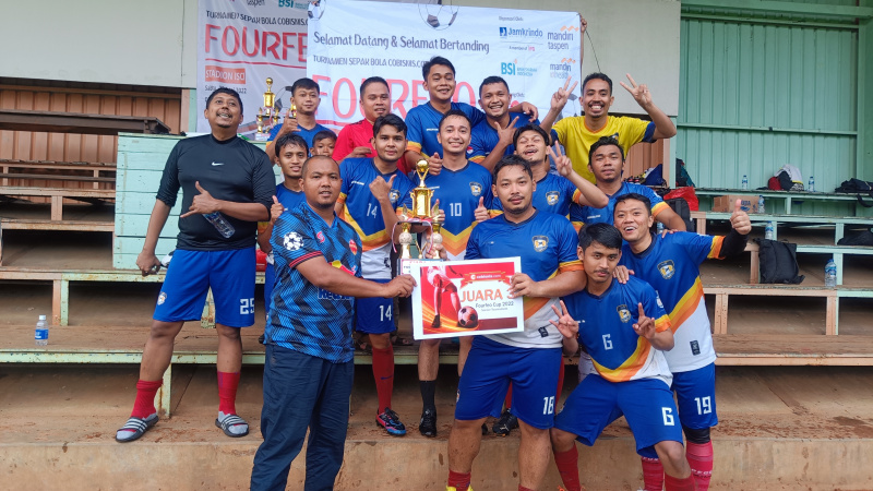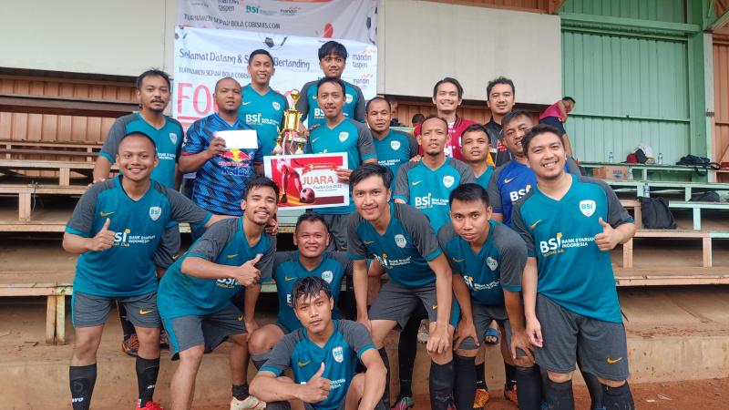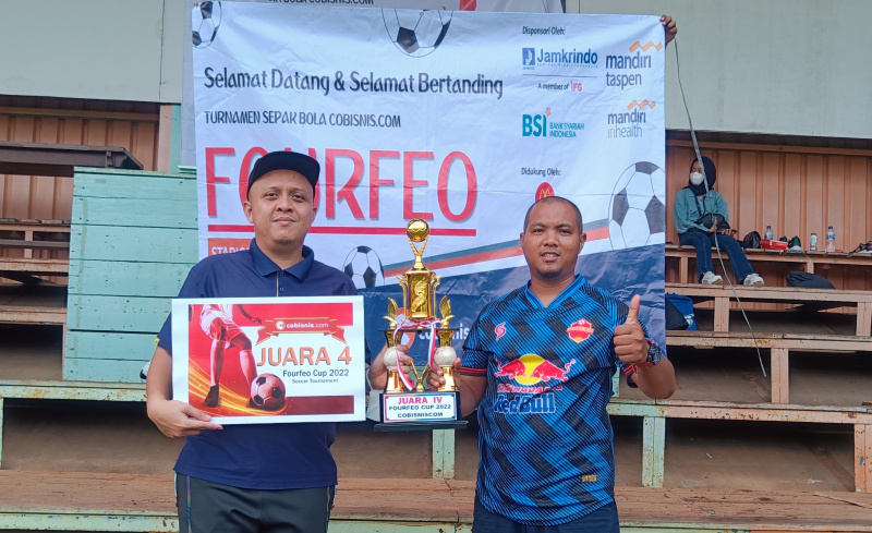 Perwakilan Cobisnis.com, Riezki Meirino (kiri) berfoto bersama Tim Sepak bola dari Bank Mantap setelah memberikan piala juara pertama di Kompetisi Sepak bola Fourfeo Cobisnis 2022 di lapangan International Sports Club of Indonesia (ISCI), Tangerang Selatan, Sabtu (25/6). Kompetisi sepak bola yang diadakan dalam rangka memeriahkan Ulang Tahun Cobisnis.com yang ke-3 ini diikuti oleh empat perusahaan yakni dari Jamkrindo, Bank Mantap, Bank BSI dan Mandiri Inhealth. Bank Mantap keluar menjadi juara pertama setelah melewati babak adu penalti melawan Bank BSI yang menjadi juara ke-2 di babak final, sementara juara ke-3 diraih oleh Mandiri Inhealt dan ke-4 diraih Jamkrindo.