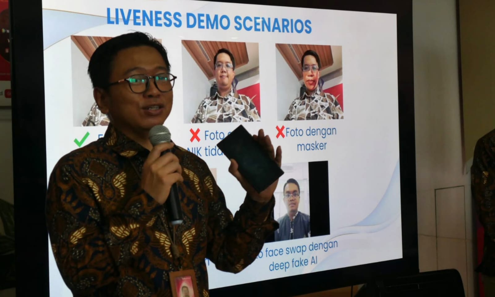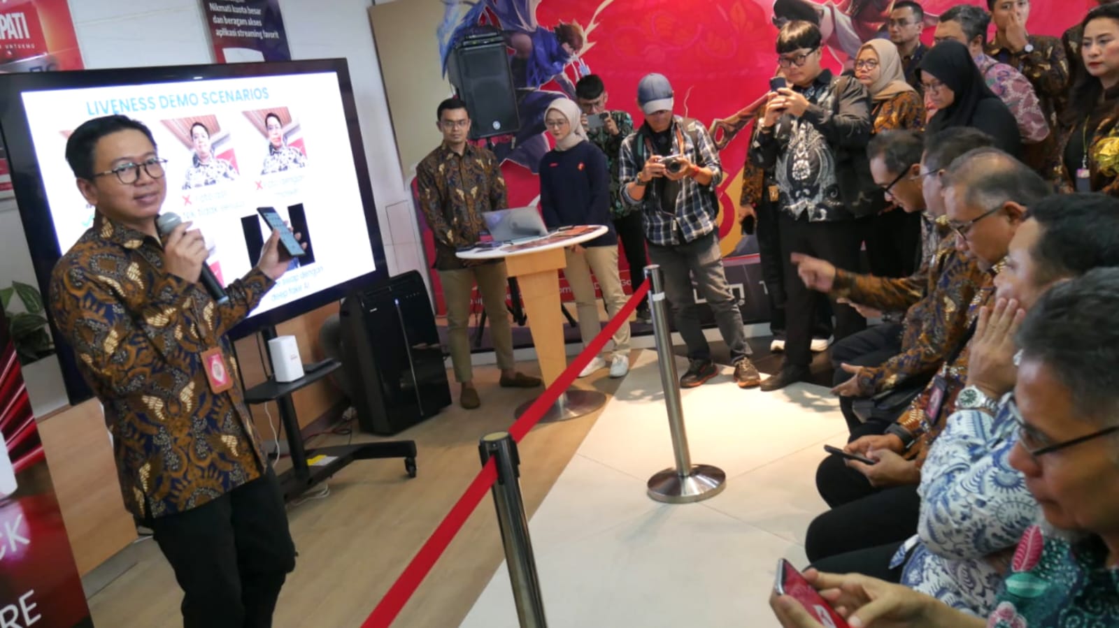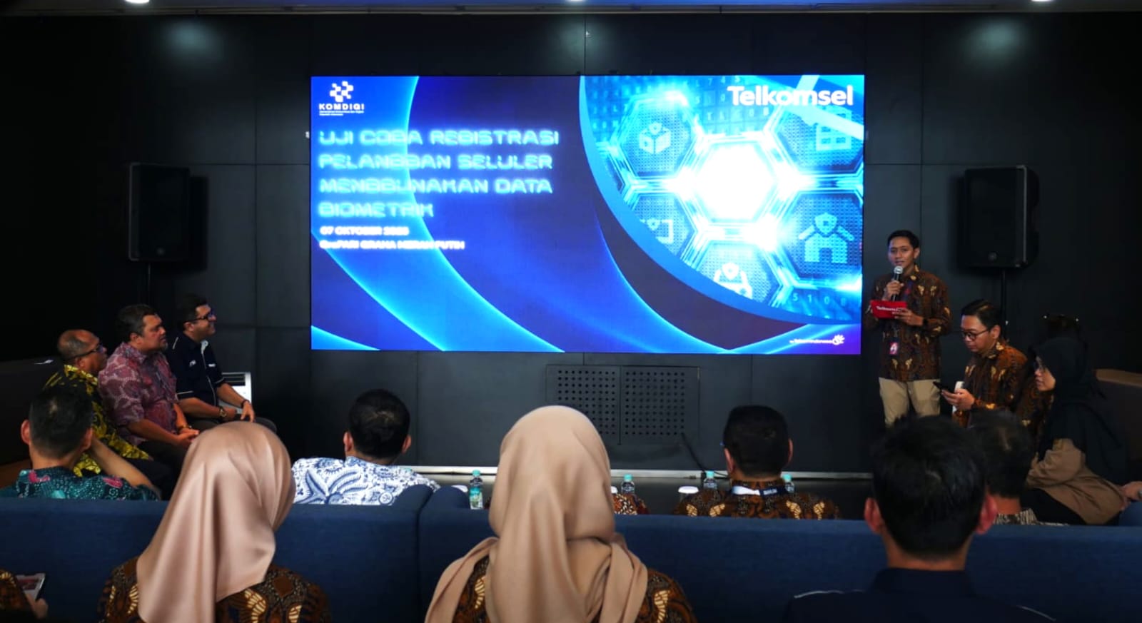 (Dari kiri) Direktur Sales Telkomsel Stanislaus Susatyo, Dirjen Ekosistem Digital Kementerian Komunikasi dan Digital (Komdigi) Edwin Hidayat Abdullah, dan Vice President Regulatory Management Telkomsel Daniswara Pandina saat melakukan uji coba registrasi pelanggan jasa telekomunikasi menggunakan data kependudukan biometrik di Jakarta, Selasa (7/10/2025). Telkomsel bersama Komdigi menggelar uji coba tersebut untuk memperkuat keamanan identitas digital dan perlindungan data pelanggan. Dalam uji coba ini, Telkomsel menghadirkan teknologi face recognition dengan fitur liveness detection sesuai standar ISO 30107 (aktif dan pasif) untuk memastikan subjek yang hadir adalah individu yang benar-benar hidup, bukan foto, video, atau manipulasi digital (deepfake).