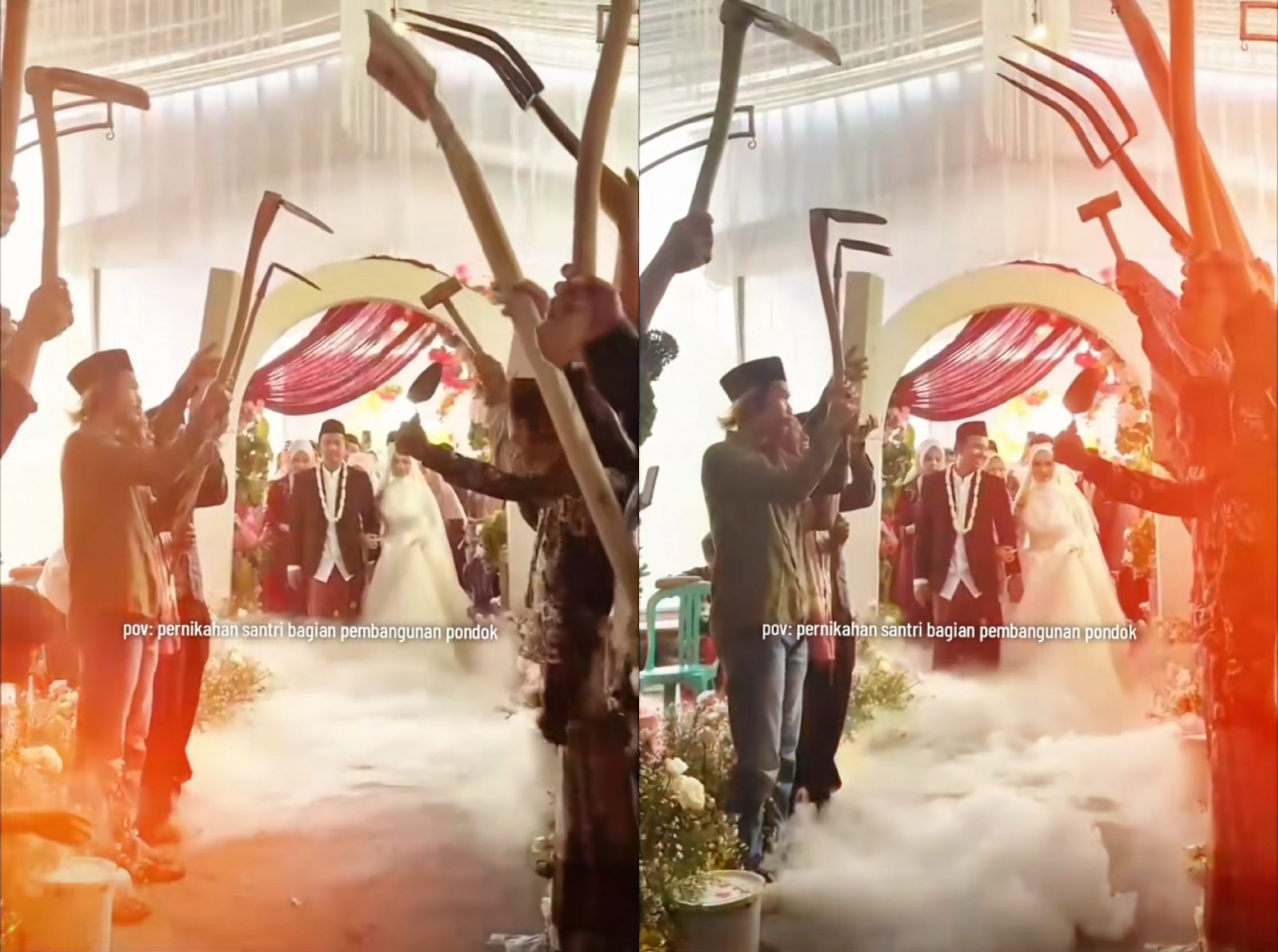 JAKARTA, Cobisnis.com – Jagat media sosial tengah diramaikan dengan video prosesi pernikahan tak biasa yang dijuluki “Pacul Pora”. Jika umumnya pasangan pengantin menggunakan tradisi Pedang Pora, mempelai pria yang diketahui seorang santri ini justru menghadirkan lorong kehormatan dengan pacul dan sekop.