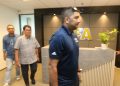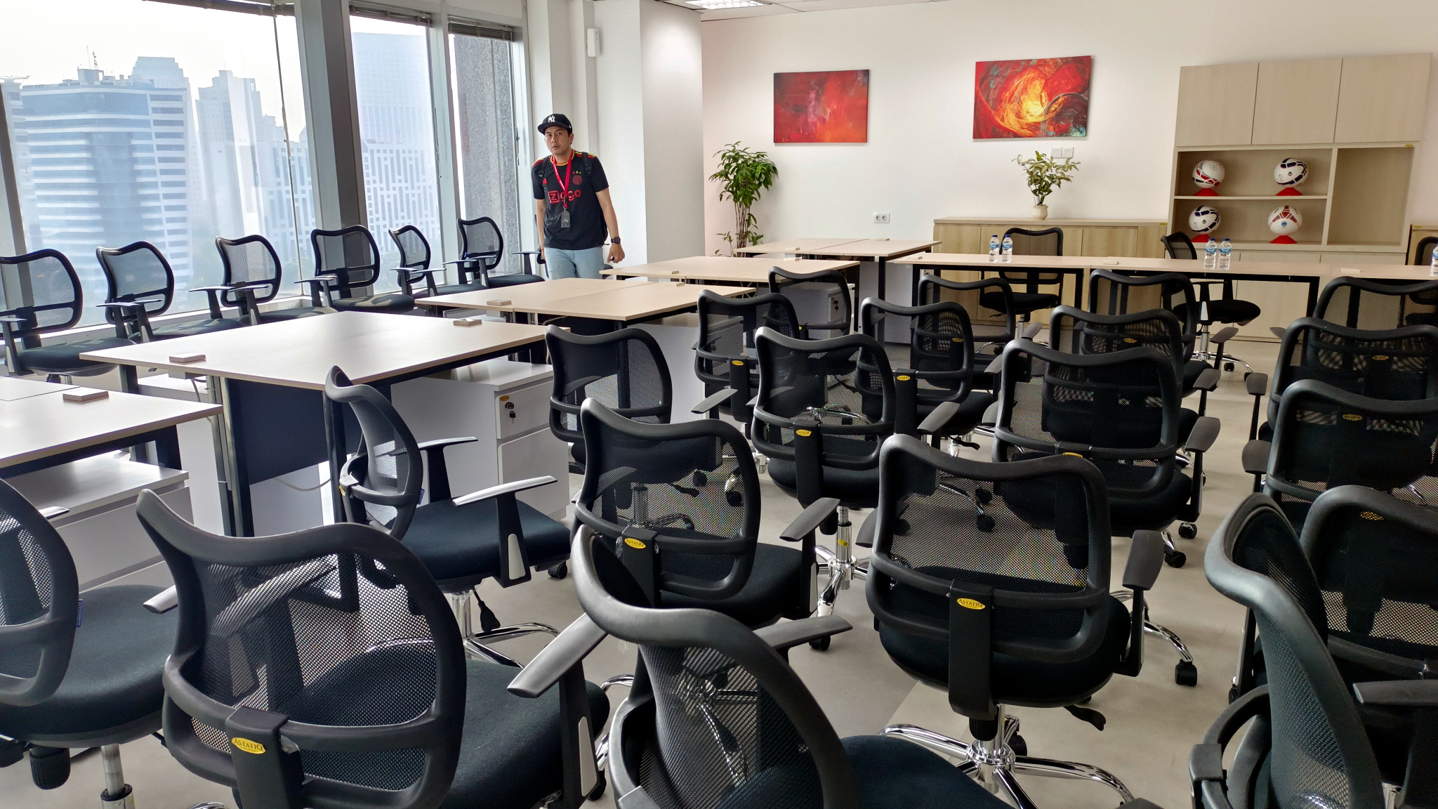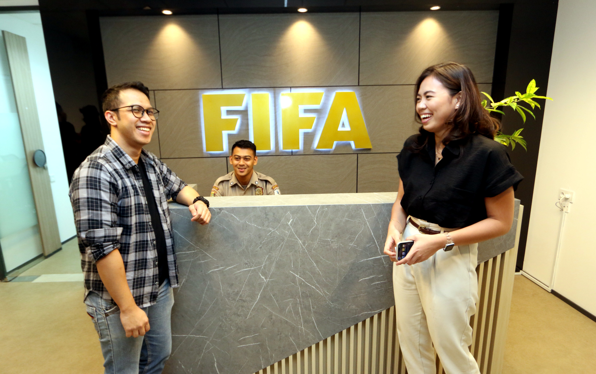 petugas sedang berbincang di lobi kantor yang diusulkan menjadi kantor perwakilan Induk Olahraga SepakBola Dunia (FIFA) di Indonesia di Menara Mandiri II, Jakarta, Jumat (4/8). Berlokasi di lantai 12, ruangan ini diusulkan PSSI untuk menjadi kantor perwakilan FIFA yang akan menyelenggaran Piala Dunia U17 di Indonesia. Ruangan tersebut juga telah dikunjungi oleh perwakilan FIFA Regional Asia Pasifik untuk observasi.