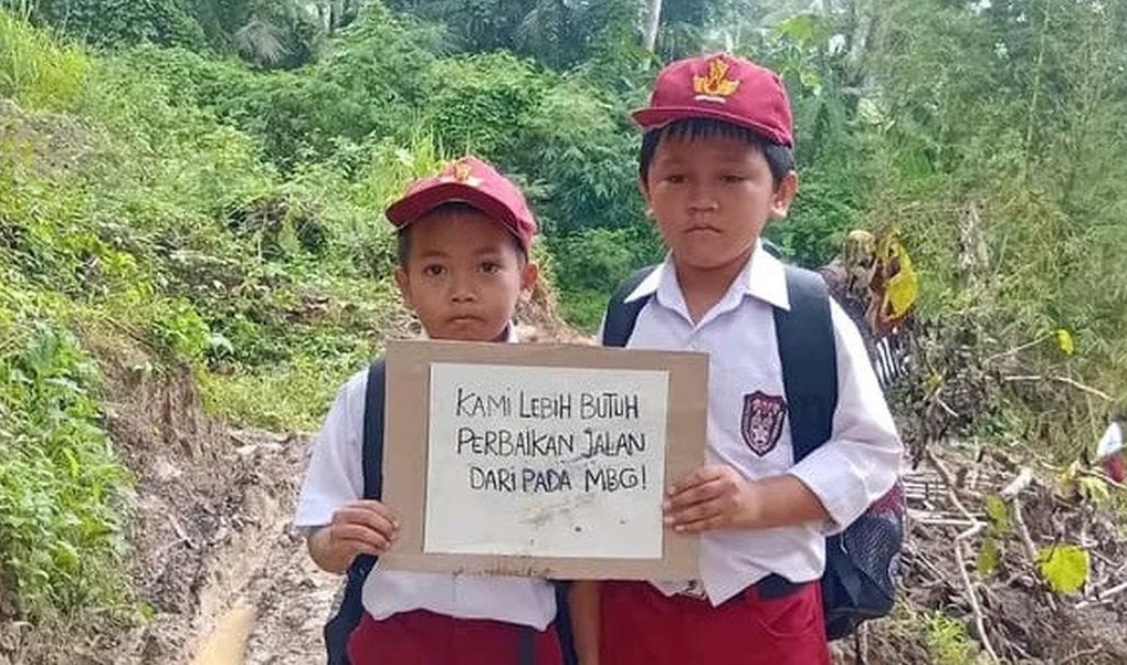 Situasi ini mencuat ke publik setelah beredar foto viral siswa SDN Sukamukti yang berdiri di tengah jalan berlumpur sambil membawa poster bertuliskan, “Kami butuh perbaikan jalan daripada MBG!”. Tulisan tersebut menjadi bentuk kritik simbolik terhadap kebijakan yang dinilai belum menyentuh kebutuhan dasar masyarakat.