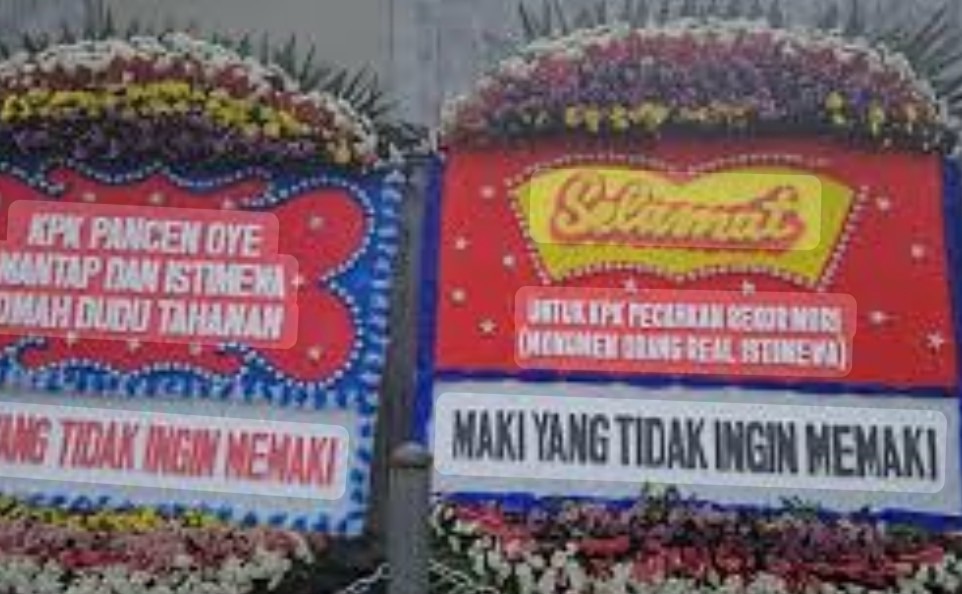 Karangan bunga yang dikirim oleh Masyarakat Anti Korupsi Indonesia (MAKI) terlihat terpasang di depan Gedung Merah Putih KPK. Tulisan dalam karangan bunga tersebut mengandung sindiran, namun tetap dianggap sebagai bentuk perhatian masyarakat terhadap proses hukum yang sedang berjalan.