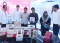 (Ki-ka) Chief Marketing Smartfren Officer, Sukaca Purwokardjono, Direktur & Chief Commercial Officer XLSMART, David Arcelus Oses dan Presiden Direktur & CEO XLSMART, Rajeev Sethi melayani pelanggan dalam acara Hari Pelanggan Nasional di Galeri Smartfren, Jl. Sabang, Jakarta Pusat. Kamis (4/9)